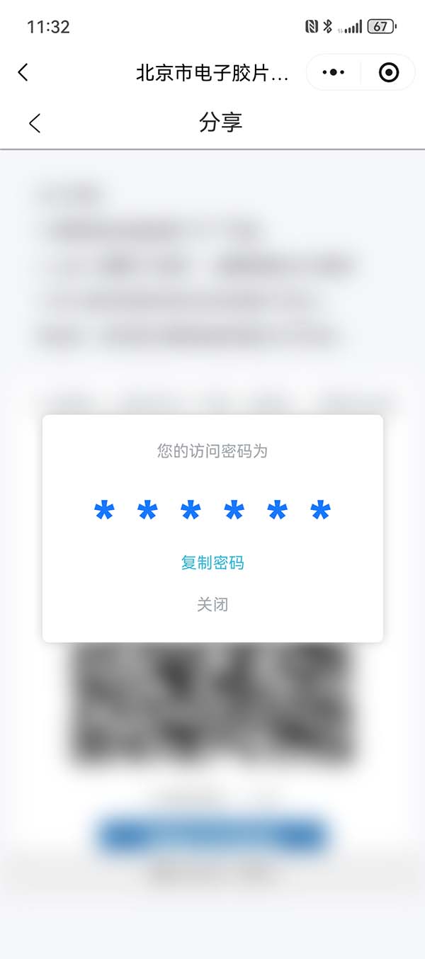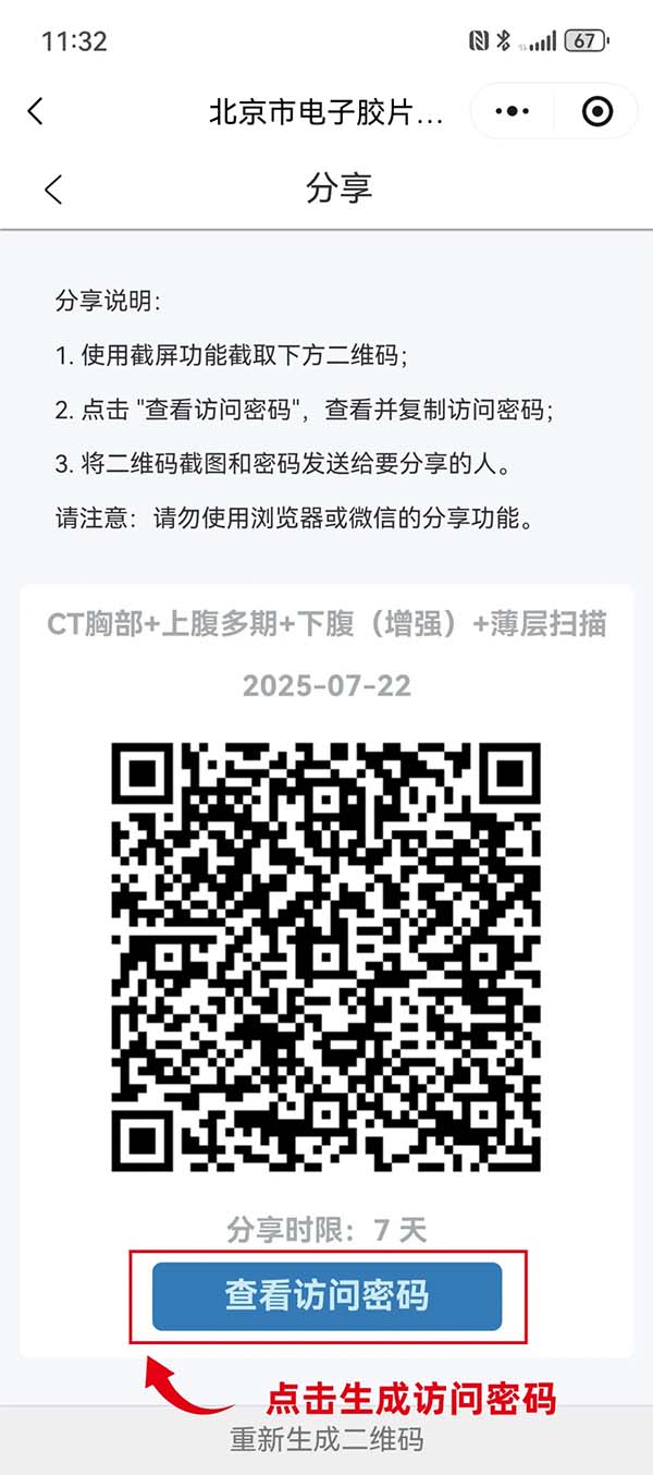 在检查信息页面点击「检查分享」生成分享二维码→ 点击「查看访问访问密码」,查看并复制访问密码,与二维码一同分享即可。