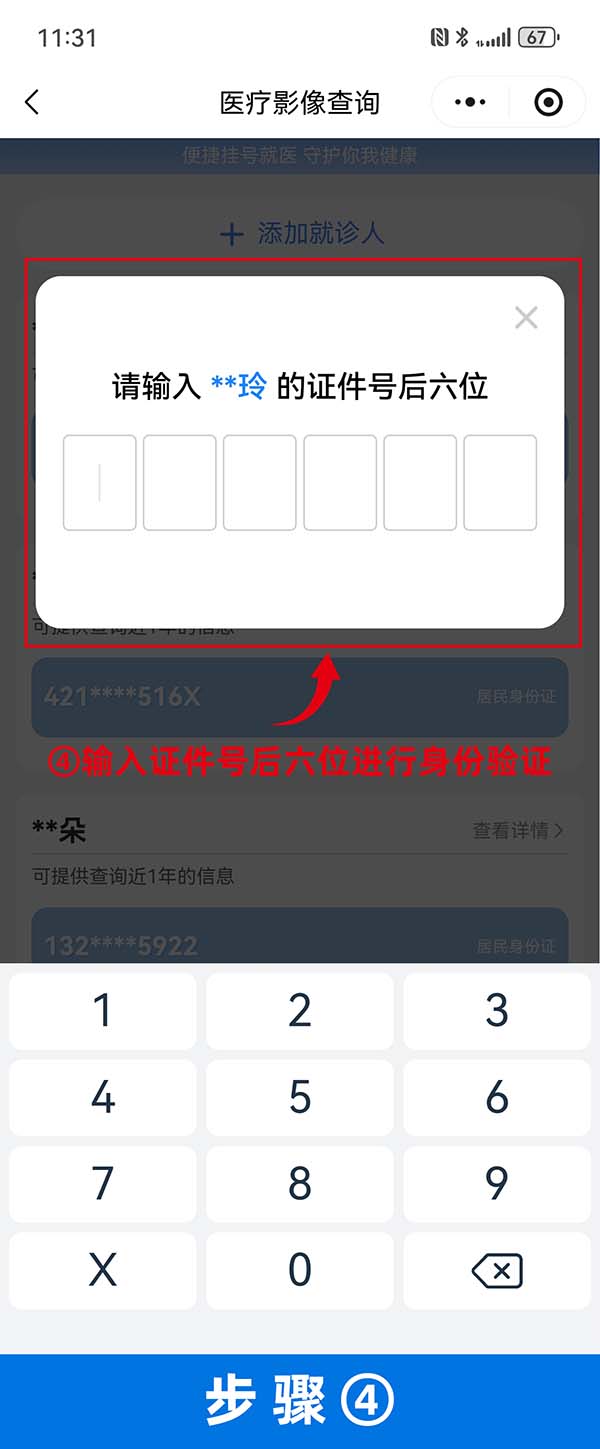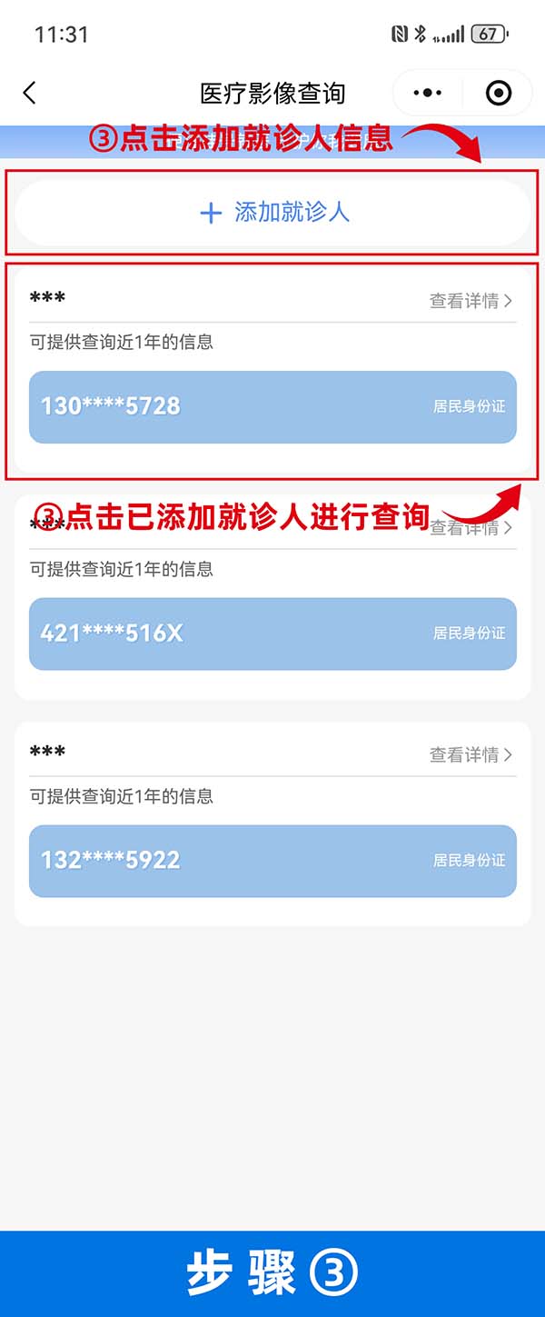 ①微信或支付宝打开「京通」小程序,在首页点击「预约挂号」或「健康服务」入口 → ②点击「影像查询」功能 → ③选择或添加需要查询的就诊人信息→ ④输入证件号后六位,完成身份验证 → ⑤选择对应的检查项目,查看检查详情。