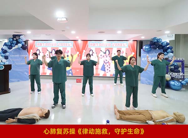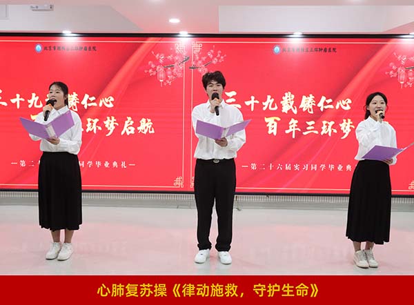 实习同学们通过丰富多样的形式充分展现实习风采、深情诉说医者情怀。实习展风采视频《白衣为甲,逐光而行》,生动定格了大家穿梭病房、虚心学习的珍贵瞬间;舞蹈《如愿》、三句半《实习践初心 共筑百年梦》、武术《形意拳》、诗朗诵《三环·薪火》依次精彩上演,风格各异,或柔美优雅、或诙谐幽默、或刚劲有力、或深情动人,充分彰显新时代医学生的青春活力与医者担当;心肺复苏操《律动施救,守护生命》以规范整齐的动作,充分展现出同学们扎实过硬的急救专业技能,深刻诠释医者守护生命的专业素养与责任担当。